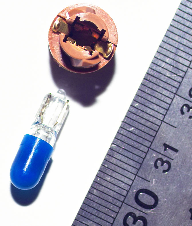 There is a blue plastic sleeve which is rolled over the globe like a mini "rubber" to give it the blue colour so don't chuck it out! Access is by removing steering column cover (screws under) and then the dash cover screws, globes are in bayonet holders which turn 1/4 to release. I'm off to do mine now. cheers LWC |